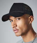 Polyester mesh rear panels. 5 panel. Structured front panel. Pre-curved peak. Snapback size adjuster. Tear out label.